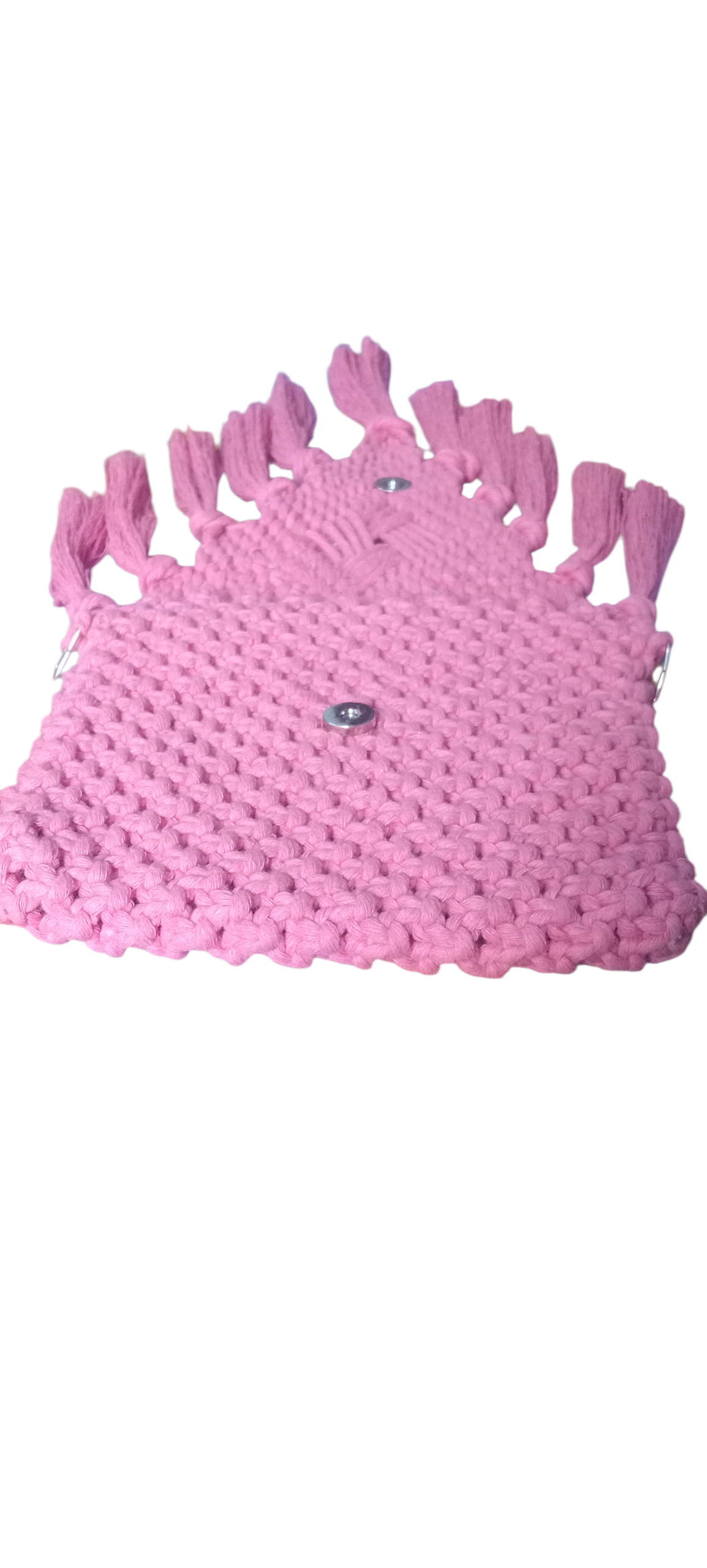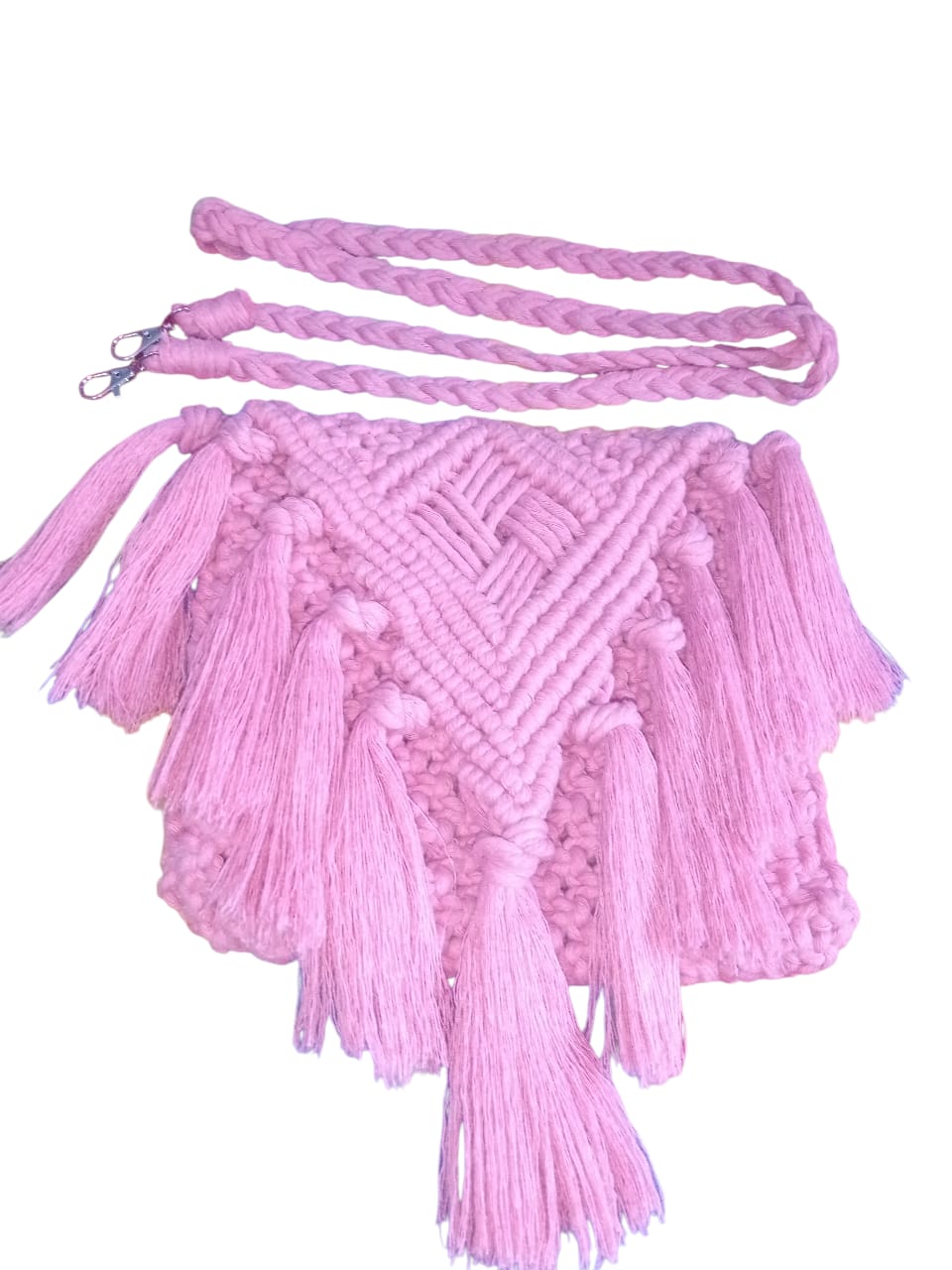 This unique, handmade macrame baby pink colour bag features a beautiful woven design and charming fringe detail. Perfect for adding a touch of bohemian style to any outfit. Use it as a casual purse or a statement accessory for festivals and events.