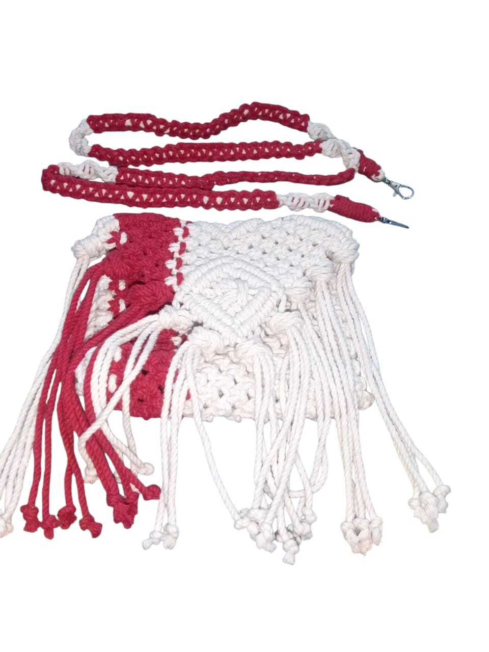 This unique, handmade macrame sling bag is perfect for adding a bohemian touch to any outfit. Featuring intricate knotting and a stylish fringe, it's ideal for carrying your essentials.