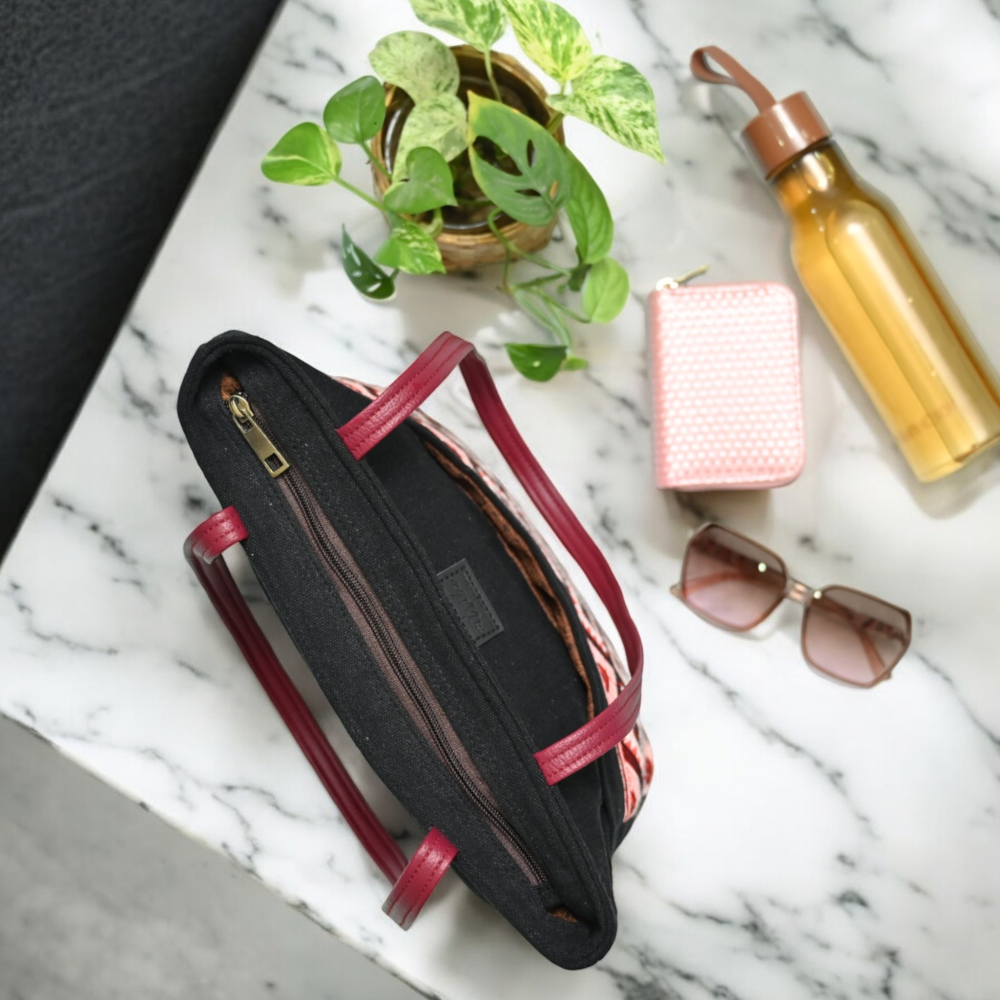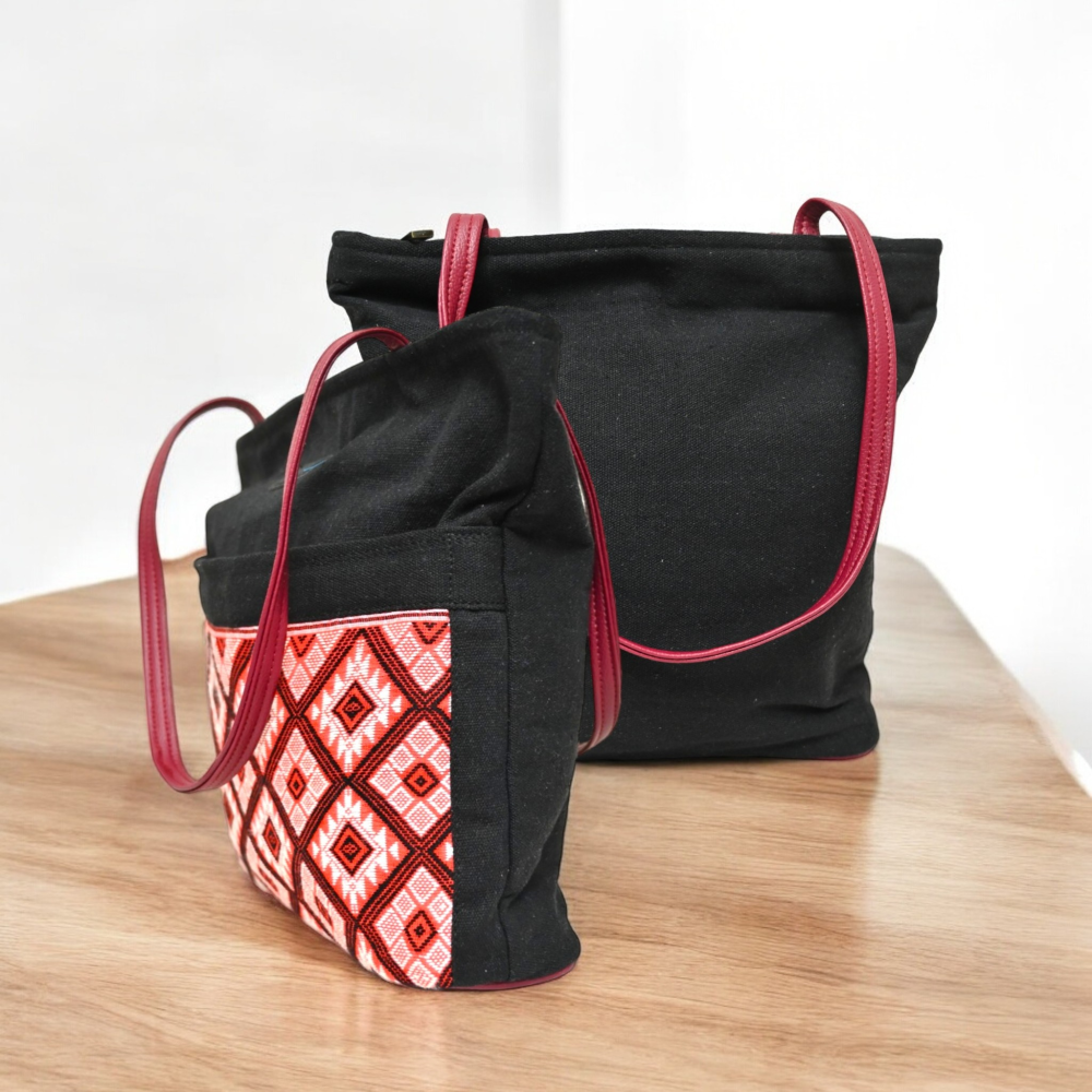 "Artisan Elegant Tote" – where elegance meets artistry! This striking black and red bag features an explosion of colorful motifs that catch the eye and spark conversation. Crafted from high-quality cotton canvas, it offers both style and functionality, complete with a reliable zipper closure for your essentials. Carry your world in style! Dimension: 12 inch x 11 inch X 3 Inch(Lx H X W) Premium fabric lining Triple Zipper closure Weight: 0.4 kg Each bag may differ from each other on the design as different sections get cut from the same stretch of handmade motif . *There may be a slight difference in the tone of colors depending on the resolution of your monitor *There may be a slight difference in measurements depending on how the item is measured.
