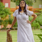 The designerwear named “Aria Whispers”, handcrafted from handwoven Muslin cotton, embodies a remarkable combination of elegance and delicacy. Muslin cotton is known for its lightweight and breathable nature, making it a suitable choice for creating garments with a graceful drape The designerwear’s design showcases meticulous craftsmanship and attention to detail. Every stitch and fold is carefully curated to create a flowing and elegant silhouette. The fabric drapes beautifully, enhancing the wearer’s figure and exuding a sense of femininity. The elegance of Aria Whispers lies in its graceful and refined designs. The designers behind the dress carefully curated the patterns, cuts, and embellishments to create garments that exude sophistication and style.Each piece is meticulously crafted to enhance the wearer’s beauty and create a sense of effortless grace. The fabric’s lightweight and airy nature give the garments a gentle and ethereal quality, making them perfect for occasions where a soft and feminine touch is desired. The delicate texture of Muslin cotton adds a sense of refinement to the overall design, making Aria Whispers a choice that is both comfortable and luxurious. Bust Size : M(38inches) Fit : Free Flowing. Fabric : Premium Handwoven Muslin Cotton Transparency : Opaque Occasion : Official/Holidays. Print or Shade :Ivory White. Shape L Hemline : A Line Long Sleeve Style :Ruffled Draped Sleeves. Knit or Woven : Hand Woven. WASH CARE Dry Cleaning Re