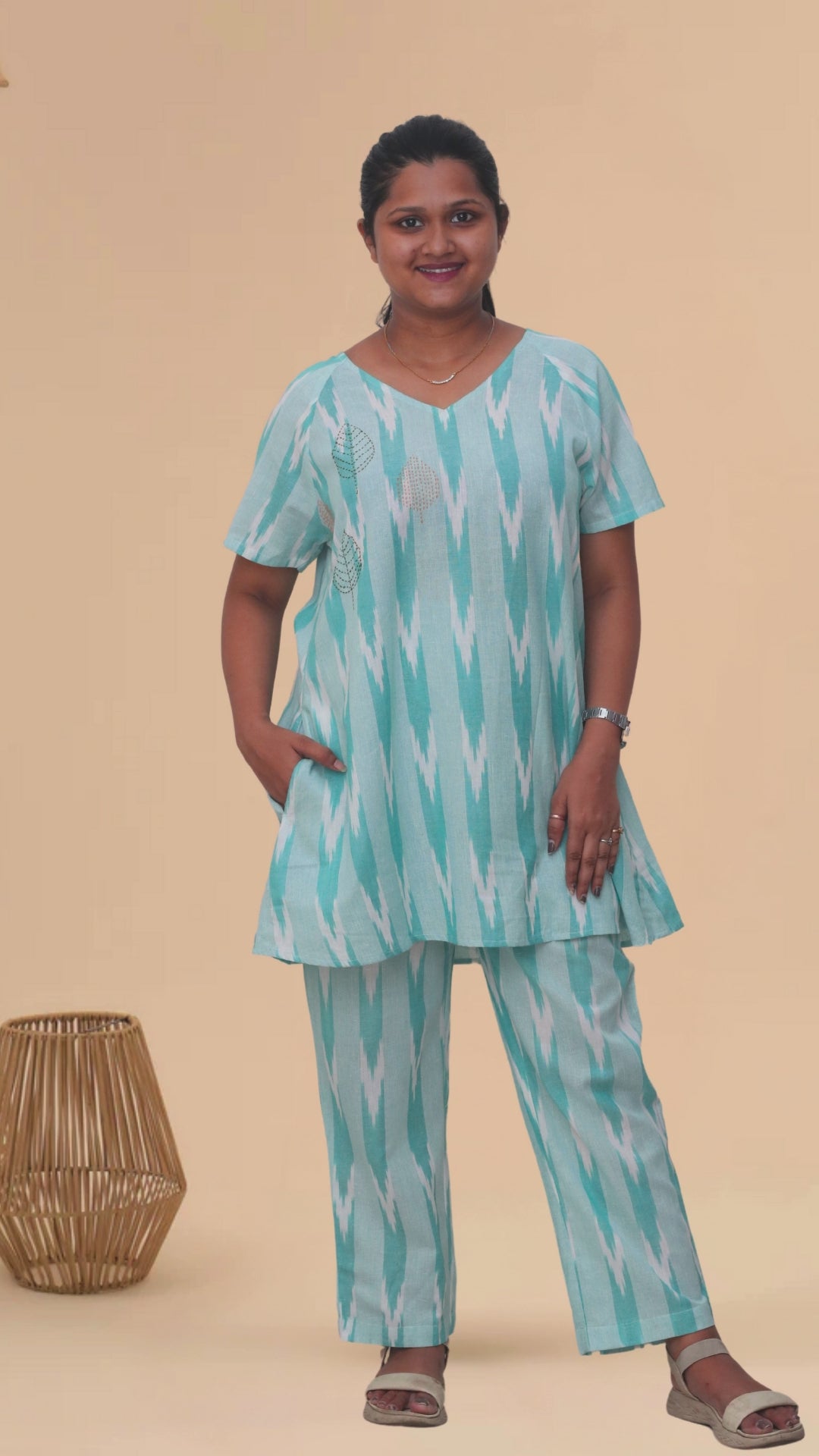 An Ikat cord set is a coordinated outfit made from handwoven Ikat fabric, featuring its signature blurred patterns. Stylish and comfortable, it’s perfect for casual outings or semi-formal occasions, offering a chic and effortless look