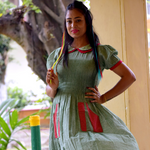 Smart fit, A Line One-Piece Frock Slim Dress with Short Sleeve and Peter-pan Collar for a beautiful vacation. Buttoned front with vibrant Embroidery for a fun look . The Short sleeves are fitted at the shoulder, and the umbrella-cut skirt gives a full flare so you can breeze through your day! It comes with a smart “loop Down” pocket for Your essentials. Model is 5’4 and she is wearing size S. The fabric is handwoven in Bengal and handcrafted by our skilled Dress Makers in Kolkata . PRODUCT ATTRIBUTES Knit/Woven: Hand Woven Gender: Female Available Size: S(36) M (38) L(40) Base Color: Pastel Green Dress Shape: A-Line Neckline: Peter Pan Collar Sleeve: Short Sleeves Buttons: Handcrafted horn Buttons. Surface Styling:Embroidered Fit: Loose Fit Length: Below the Knee Craft: Hand Embroidery Material: Hand loom Cotton Country of Origin: India Proudly supporting the craftspeople of Bengal,India. Care Instruction: *Washing: Best to hand-wash with cold water. *Drying: Lay flat to dry or tumble dry low *Ironing: Iron/steam on the wrong side (the inside), only with Cotton/Linen washing option. *Do not bleach