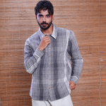 """-This is a classic oversized shirt with slight drop shoulders, a side slit and a redesigned collar for a distinct appearance. - For its anti-fit look, it comes in 3 sizes only. -This is a unisex garment with relaxed and comfort fit. It features a box pleat at the back for ease of movement. -Made from kala cotton handloom & handwoven fabric in the looms of Kutch, Gujrat. - Kala Cotton is a completely rain fed fiber and grows whiter and softer with wash. It is super versatile and comfortable in all seasons. -Model Fit - Satabdi is 5'6"""" and is wearing size S for an oversize fit. We have also provided the body measurements here to help you decide which size to buy. -Actual colour may vary slightly from the pictures.""" S02_HD_BW_03_01M