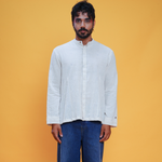 """- This shirt has a clean top with a slight flare towards the hem, created by slits and triangular godets which focuses on giving a shape to the body. - This is a unisex garrment. It has very beautiful Indigo thread detailing around the godet stitch lines. - Comes with coconut shell buttons. - Made from kala cotton handloom & handwoven Tangaliya fabric in the looms of Kutch, Gujrat. - Tangaliya is an extra weft Technique wherein the dots are meticulously woven into the fabric by twisting the thread from the index finger and the thumb. - Kala Cotton is a completely rain fed fiber and grows whiter and softer with wash. It is super versatile and comfortable in all seasons. - Actual colour may vary slightly from the pictures.""" -S07_TA_WH_01_01M