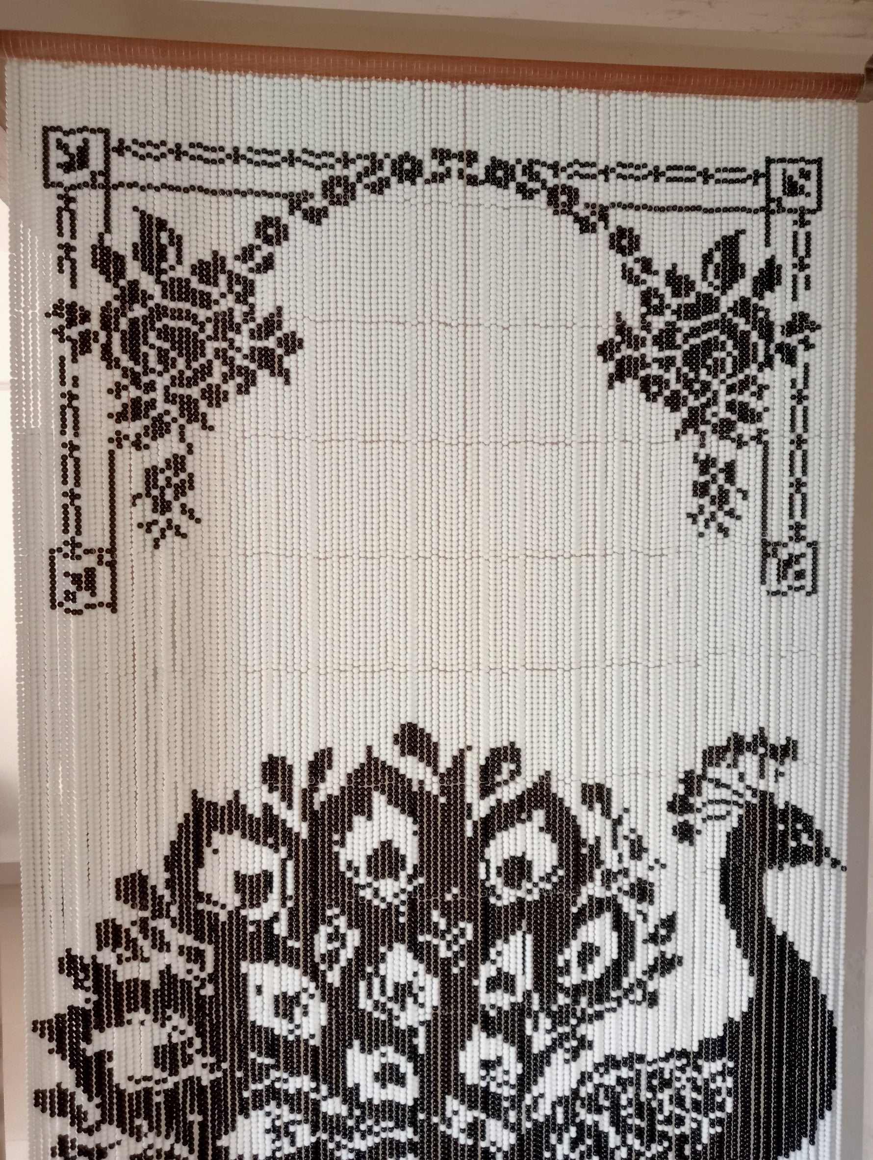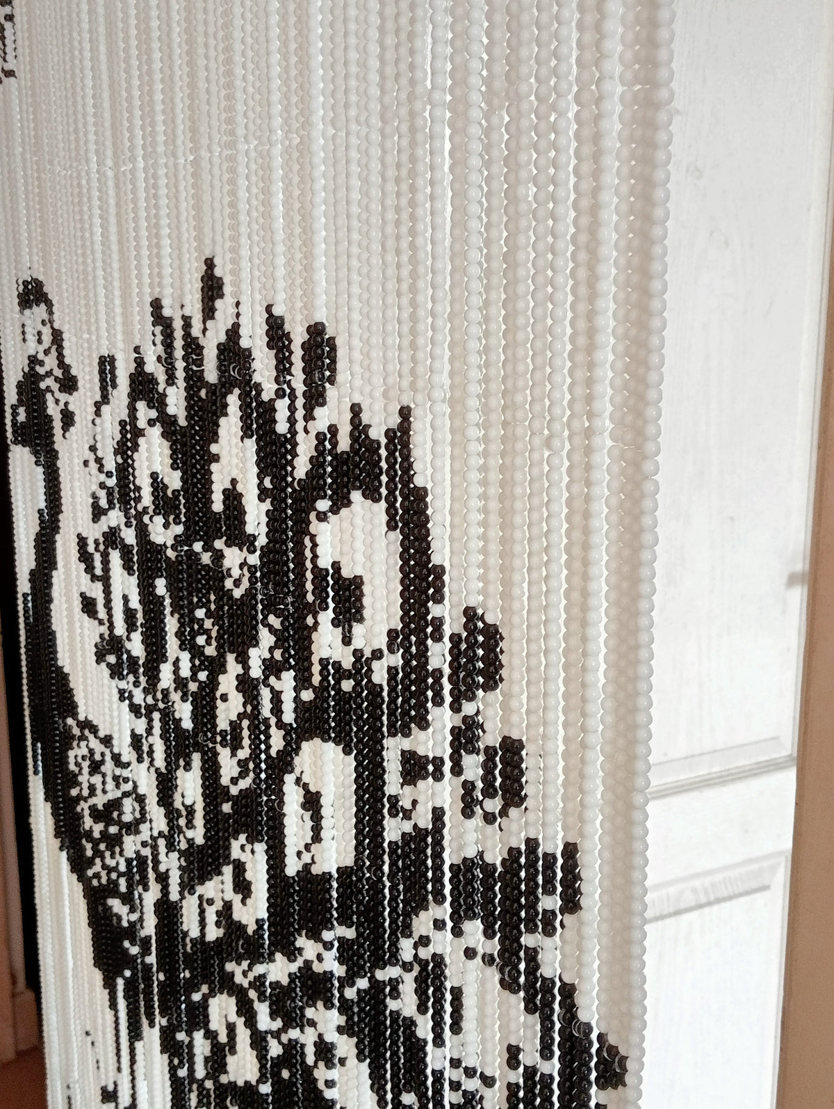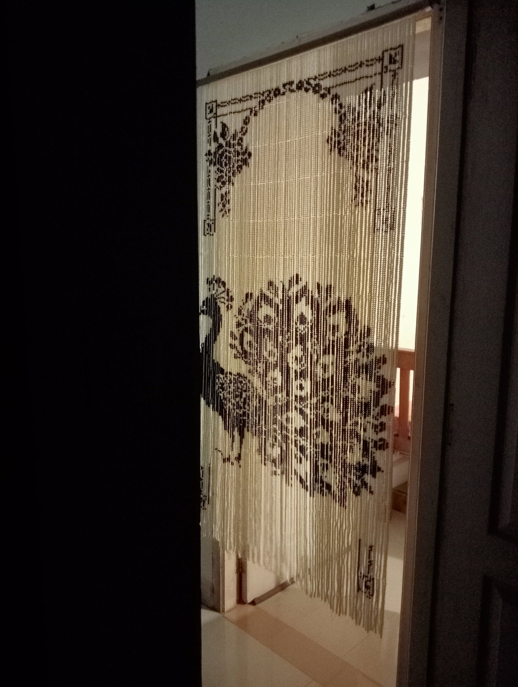 The curtain is designed for both utility and beauty. You can easily pass through—even while carrying large items—without worry. The strands are tightly secured to the wooden dowel to ensure they remain perfectly aligned and the design is always clear.