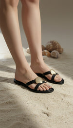 Step up your style game with our black shell-embellished flats. Featuring a sleek black base highlighted with a gold seashell accent, these flats bring a modern twist to your party looks, evening dinners, or chic casual outfits. Designed for comfort and impact, they’re a wardrobe must-have.