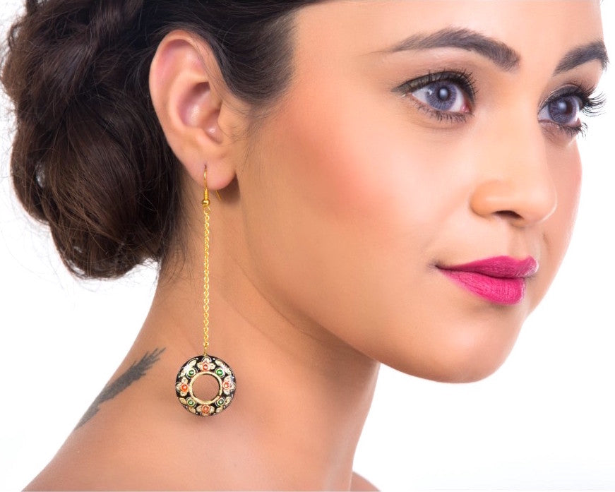 Look chic in the Black Onyx drop earrings with intricate gold Kundan work. Available In: Black ; Gold combo with tinge of red ; green Dimensions: Total length 9 cm. Onyx diameter 2.2 cm Care Instructions: Wipe with damp, soft cloth. Stains should be removed with mild soapy solution on rag. Don't dip it into liquid. Dry thoroughly. Sensitive to heat.