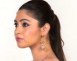 Dazzle in these lovely contemporary Kundan work drops. Festive-wear / Party-wear earrings. Total earrings length is 7cms. Material used: Base metal is copper, with rose gold plating. Silver Kundan work. KUNDAN is unique style of jewelry in which glass pieces are embedded in gold or silver foil to create absolute masterpieces.To learn more about this beautiful art form, read here. Care Instructions: Keep it away from spray perfume/deo/moisture. Store it wrapped in soft cotton cloth.