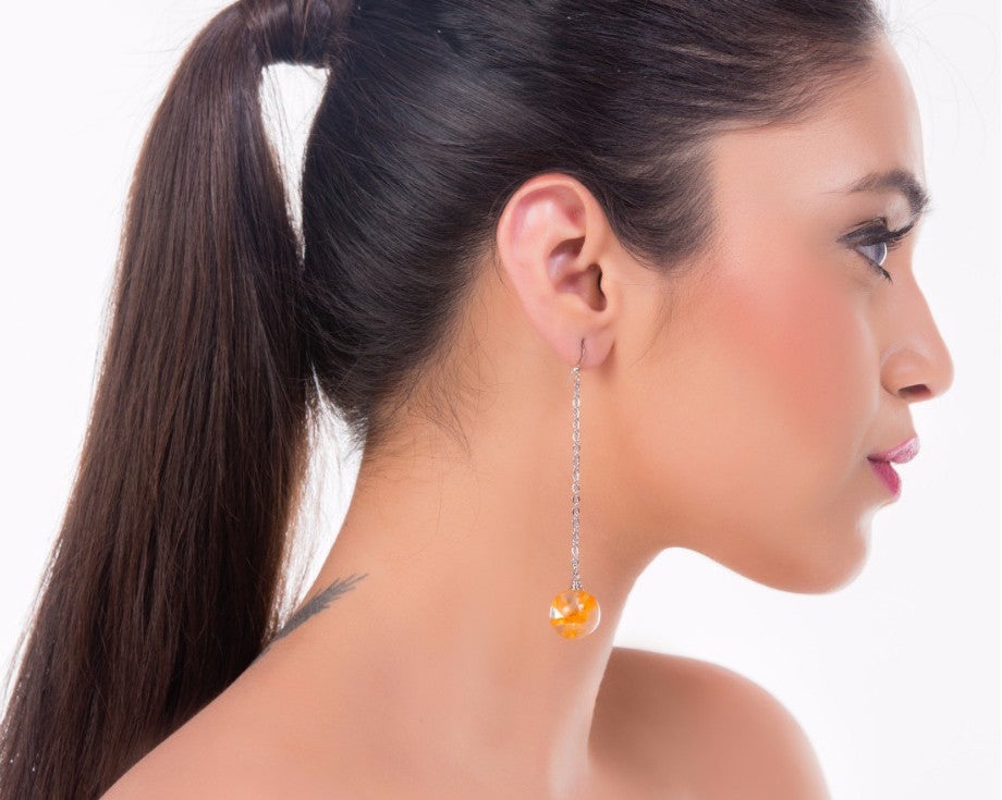 Glisten up your day with these radiant drops packed with the real flower petals. Metal parts in brass. Petals of flower : Crossandra Available In: Orange ; silver Combo Dimensions: 7cm total length. Drop diameter - 1.3cm Care Instructions: Keep it away from perfumes ; moisture.