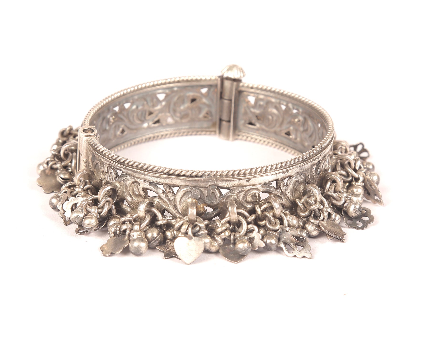 Openable bracelet with hanging charms (heart, stars, flowers, balls), inspired by ancient Himalayan jewelry. Product weight is 85gms. Metal parts: Sterling silver with oxidized finish Sterling silver is also popularly known as ‘ sterling silver 925 ’ or simply ‘ 925 Silver ’. It is a metal, which consists of 92.5% pure silver (which is why it gets its name as sterling silver 925) and 7.5% alloy that can include other metals such as zinc, copper etc. To learn in detail about sterling silver metal and why should you buy sterling silver jewelry, read here . Size: 6.5cm inner diameter (size 2.8) Dimensions: 1.8cm broad Purity certificate available on request. Care Instructions: Rinse the jewelry with water, then dry and buff with a soft cloth. Keep it away from perfumes. Store it in airtight vacuum bag, wrapped in a soft cloth.