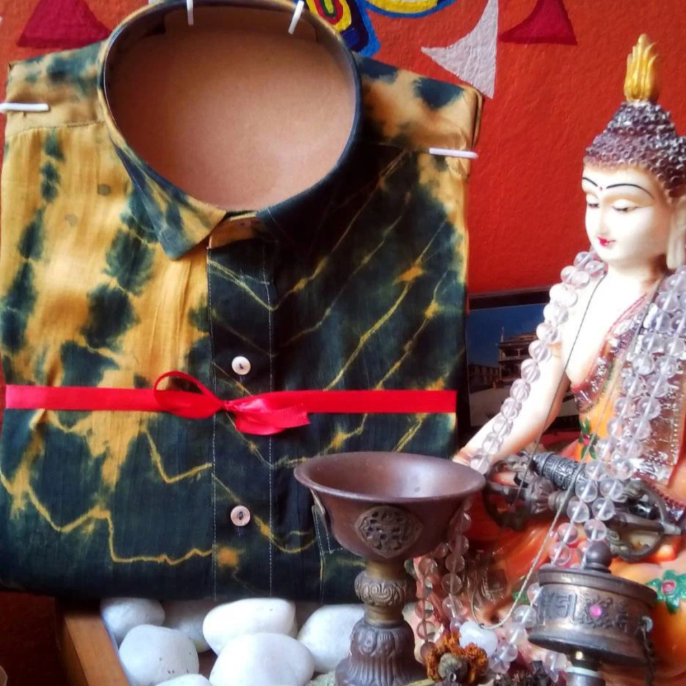 This Festive Season, redefine Style Fashionably with Shibori Dyed Silk Shirts hand dyed with Natural #Indigo & #turmeric. Your Festive Wear this Puja just got more Gorgeous while being Skin & Eco Friendly . Item: Indigo & Turmeric Root Dyed Silk Shirt 👕 Artwork: Shibori Tie N Dye . Shade: ( Blue) & ( Sunset Yellow) Buttons: Classic MOP( Mother of Pearl) buttons. Collar : Pin Down Sleeves: Half Bottom : U Cut. Chest pocket: One on Left . Sizes Available : l 40 l WashCare : Cold Water .Hand Wash l ph neutral mild soap. Sku: INDSHBSHT01 -06