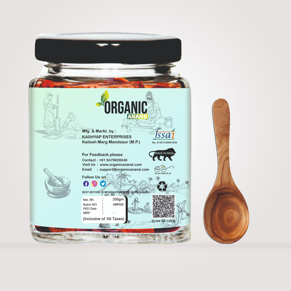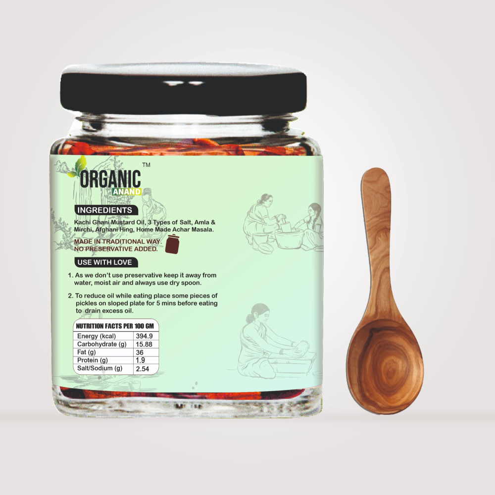 Organic Anand Pickles are completely Home-made including Pickle Masala, which are prepared in small batches with high quality ingredients using authentic traditional process to retain it's authentic taste and health benefits. We procure raw ingredients from two sources, Firstly from our own farms in MadhyaPradesh and secondly from local market. We use only Kachi ghani Mustard oil and all our items are presevative free. We use sustainable Eco friendly packaging to make our planet green again free sheesham spoon.