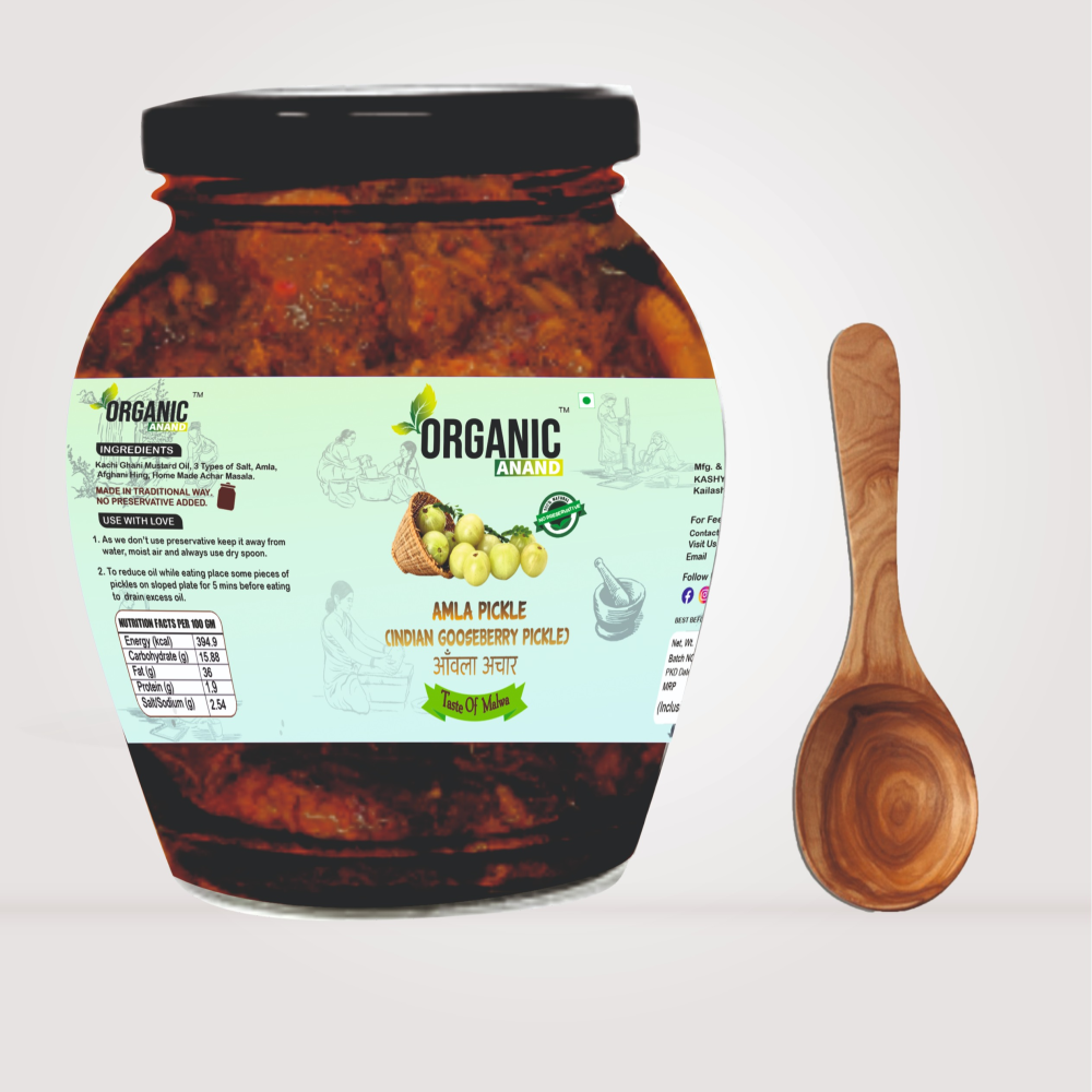 Organic Anand Pickles are completely Home-made including Pickle Masala, which are prepared in small batches with high quality ingredients using authentic traditional process to retain it's authentic taste and health benefits. We procure raw ingredients from two sources, Firstly from our own farms in MadhyaPradesh and secondly from local market. We use only Kachi ghani Mustard oil and all our items are presevative free. We use sustainable Eco friendly packaging to make our planet green again free sheesham spoon.