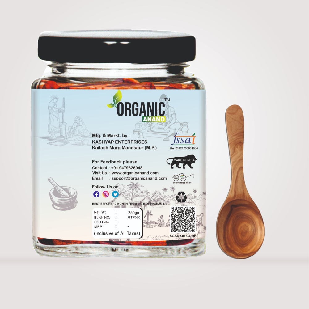 Organic Anand Pickles are completely Home-made including Pickle Masala, which are prepared in small batches with high quality ingredients using authentic traditional process to retain it's authentic taste and health benefits. We procure raw ingredients from two sources, Firstly from our own farms in MadhyaPradesh and secondly from local market. We use only Kachi ghani Mustard oil and all our items are presevative free. We use sustainable Eco friendly packaging to make our planet green again free sheesham spoon.