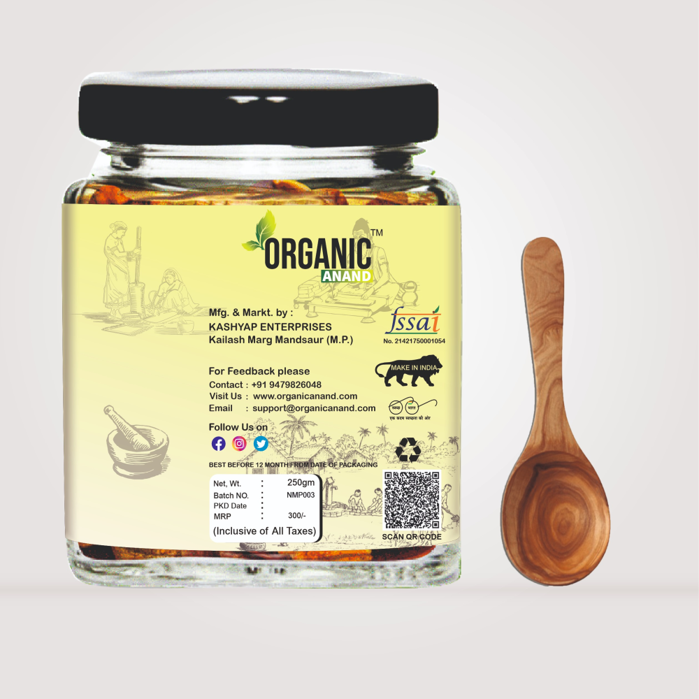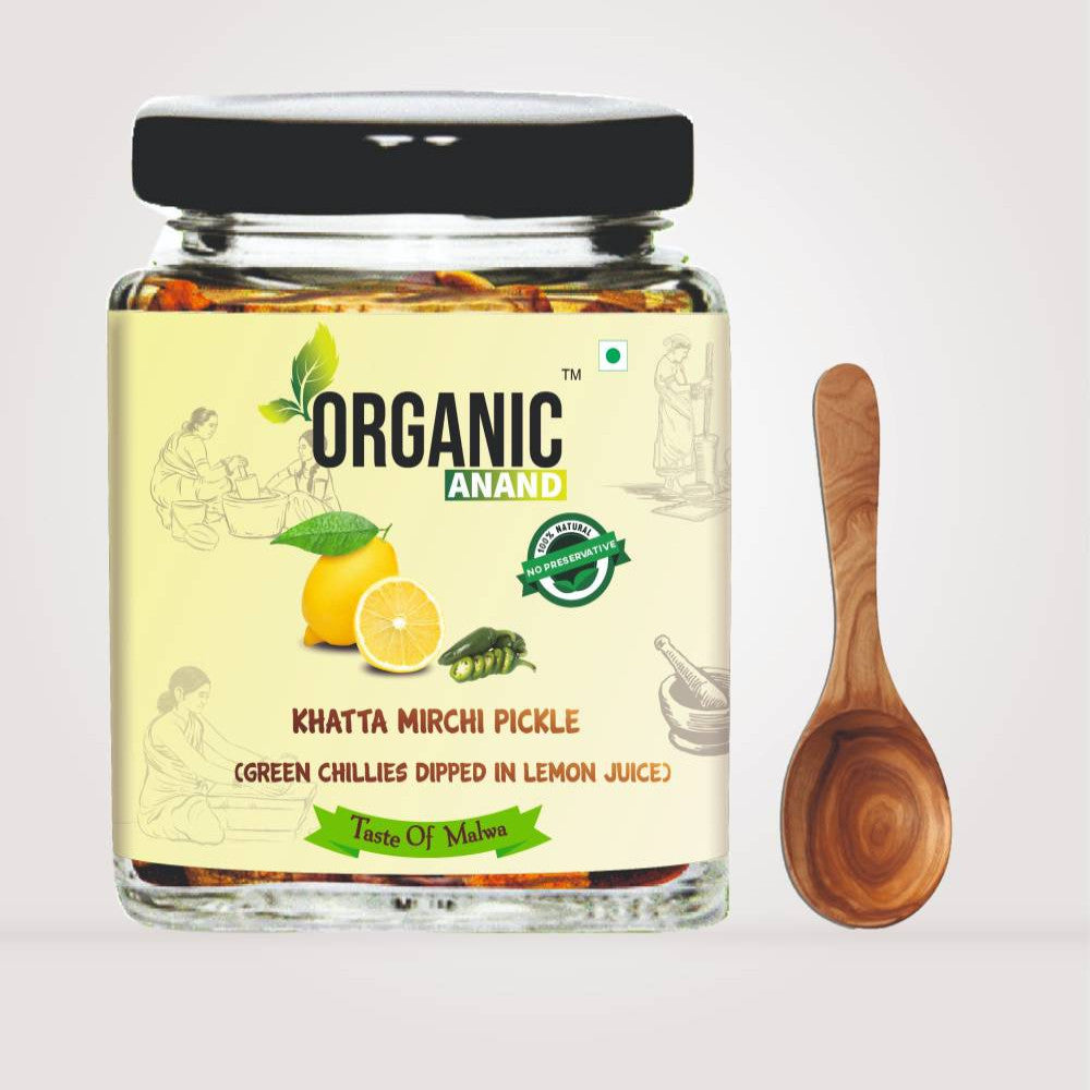 Organic Anand Pickles are completely Home-made including Pickle Masala, which are prepared in small batches with high quality ingredients using authentic traditional process to retain it's authentic taste and health benefits. We procure raw ingredients from two sources, Firstly from our own farms in MadhyaPradesh and secondly from local market. We use only Kachi ghani Mustard oil and all our items are presevative free. We use sustainable Eco friendly packaging to make our planet green again free sheesham spoon.