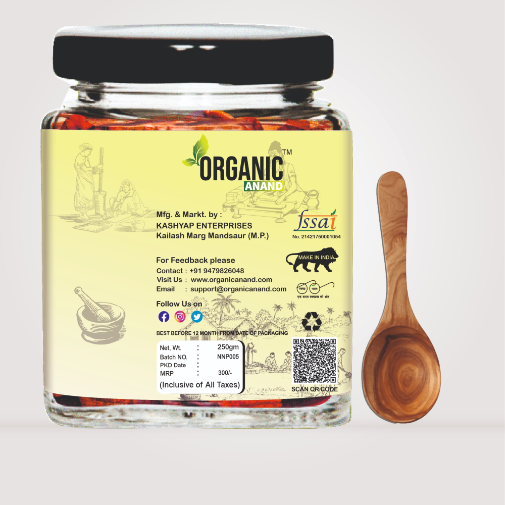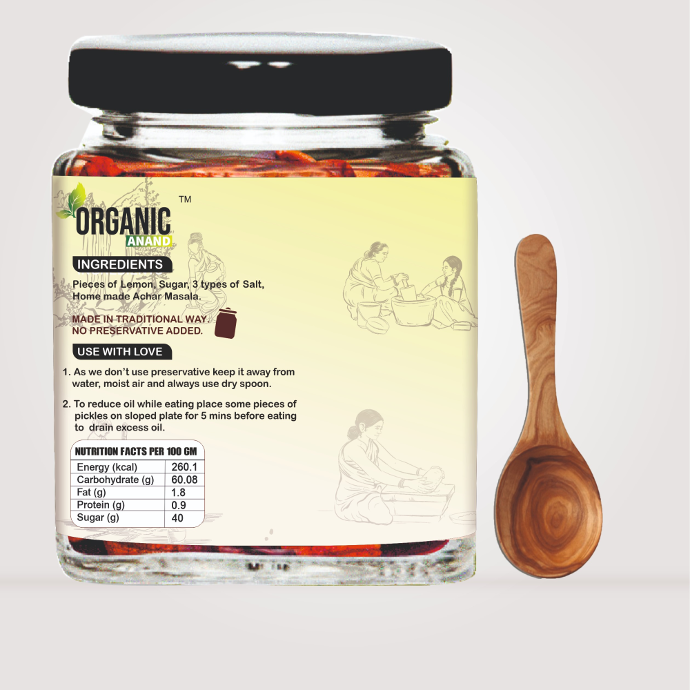 Organic Anand Pickles are completely Home-made including Pickle Masala, which are prepared in small batches with high quality ingredients using authentic traditional process to retain it's authentic taste and health benefits. We procure raw ingredients from two sources, Firstly from our own farms in MadhyaPradesh and secondly from local market. We use only Kachi ghani Mustard oil and all our items are presevative free. We use sustainable Eco friendly packaging to make our planet green again free sheesham spoon.