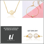 This gifting combo from our collection 'SIMPLY U' includes Classic White Pearl necklace, bracelet and stud earrings. Base metal of this jewelry is sterling silver, with 18carat gold micron plating.
