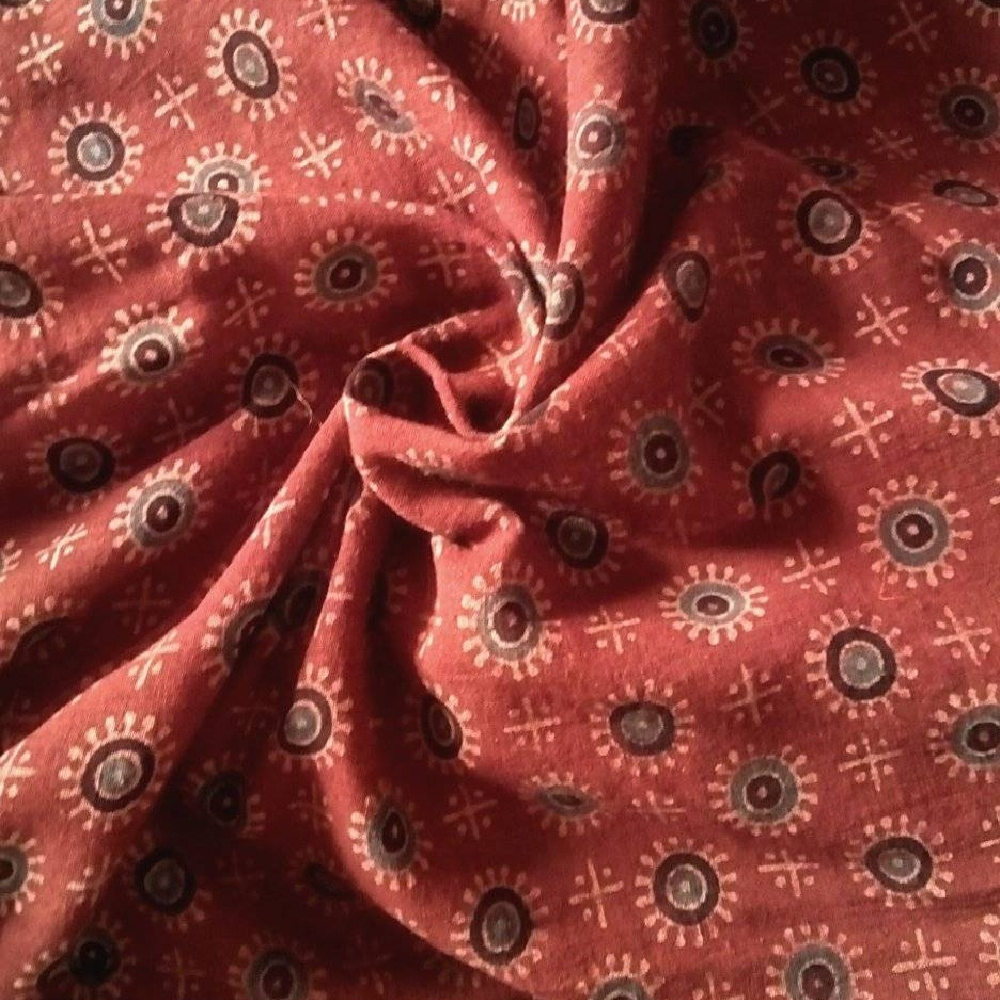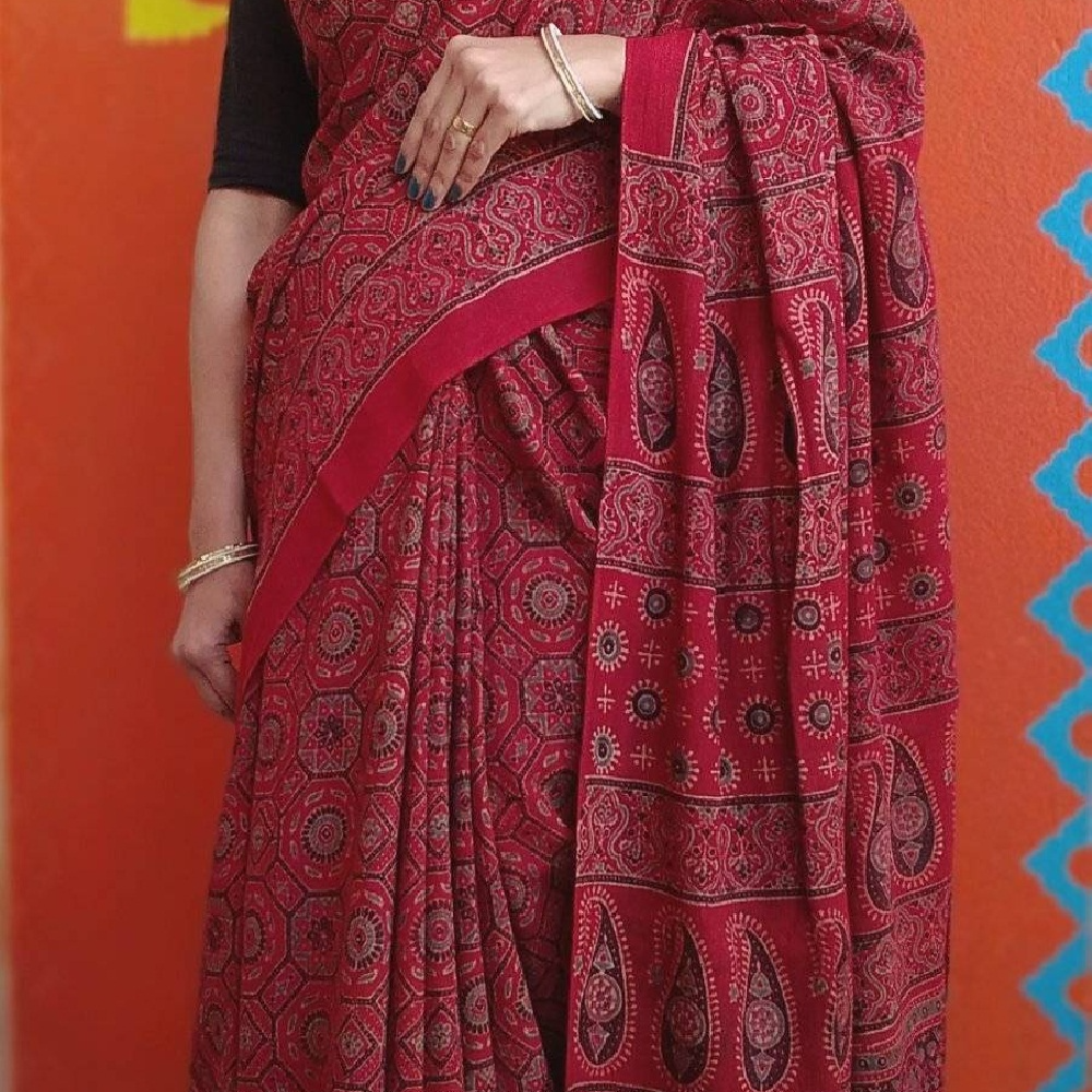 Collector's Edition Authentic AJRAKH Printed Pure Hand Woven KALA COTTON Saree with Blouse. Ajrakh are usually, patterned in intense colours predominantly rich crimson or a deep indigo with some white and black used sparingly to give definition to the geometric symmetry in design. The colours used are organic and from the nature.The traditional colours found in Ajrakh printing are deep, which symbolise nature. Pomegranate seeds, gum, Harde powder, wood, flour of Kachika, flower of Dhavadi, alizarine and locally cultivated Indigo are just some of the natural resources that Artist, State Award Winner Abdullah used in this craft . Crimson Red symbolizes the Earth, and indigo blue symbolises twilight. Black and white are used with a view to outline motifs and define symmetrical designs. Fabrics : Handwoven KALA Cotton. Shade & Tone : Crimson Red Design: Geometric Dyes : Pomegranate l Kattha l Alizarine l GumSeed Available : SINGLE Piece Hand Crafted. 1 Saree Available Only. BP : Included. Limited Edition Single Piece Handcrafted.