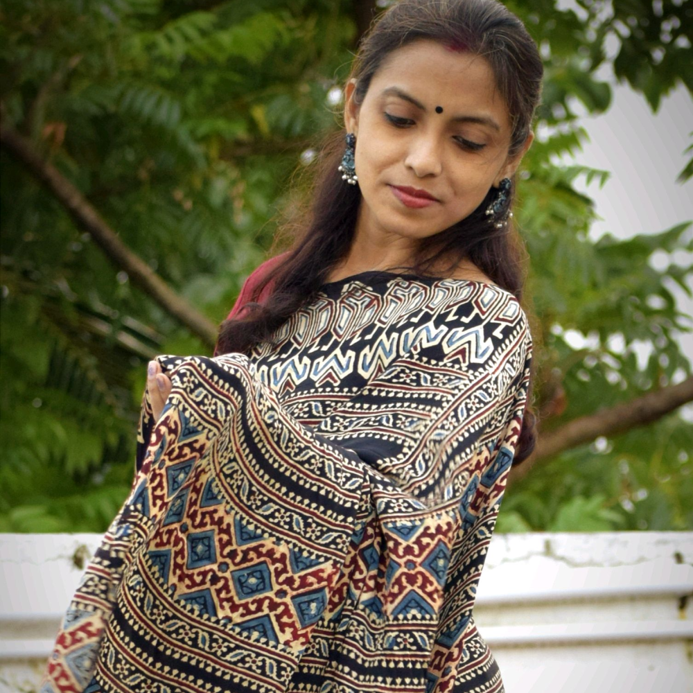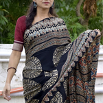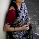 Immerse yourself in the beauty of intense jewel-like colors, with striking shades of Carbon Black and hints of white.❤️ May this festival fill your life with love, happiness, and prosperity. Share the love and spread the joy with your loved ones. The magic of the elaborate designer pallu with intrinsic "Architechtural Geometric hand block-printed unfolds the beauty of veteran Ajrakh Artisans’ Printing Skills. These Modal Silk Sarees have a fantastic fall and best suited for occasions where Your presence is appreciated and looked upon across all Weather. Country/Region of Manufacture: India. Material: 100% Silk(Modal Silk) Color: Carbon Black Artwork: Ajrakh.(Hand Block Printing) Dyes: Natural plant Extract. Design: Architectural & Nature Inspired. Blouse Piece : Included. Look : Authentic and Classy Traditional. Wash Care : Dry Cleaning Only. Modal is 50% more absorbent than cotton, Modal is excellent at wicking moisture away from the body and keeping you feeling fresh and cool. Smooth and soft by nature, Modal is a great wear for warmer temperatures. This product is hand Crafted and may have slight irregularities that are a natural outcome of the human involvement in the process. These add to the unique charm of this exquisite piece.
