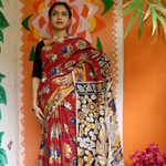 Authentically & Traditionally hand drawn & Block Print kalamkari with vegetable dyes on Pure Silk base saree. Classy, sophisticated, and very manageable saree. These colors are vegetable derived, and the cotton! Soft and heavy drapey stuff, each sari a living canvas. Size: 6.3 meters 42 inches height Fabrics Used: Premium Silk Colors: Vegetable dyes multicolors Product ID : KLMSAR011 Type : Kalamkari sarees Occasion: Can be used as casual or on semi-formal occasions, Party & Get Together Blend Artwork: Handprint, Floral pattern. Blouse : Included( Hand Block Motifs)
