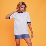 """- This t-shirt has a boxy shape and relaxed half-sleeves. - This is a unisex garment. It features a concealed zip so its easy to wear. It features pintuck details at the neck and sleeve edges to add a ribbed effect. - This t-shirt is made from kala cotton handloom & handwoven fabric in the looms of Kutch, Gujrat. - Kala Cotton is a completely rain fed fiber and grows whiter and softer with wash. It is super versatile and comfortable in all seasons. - Actual colour may vary slightly from the pictures.""" -S05_HD_KC_01_02W