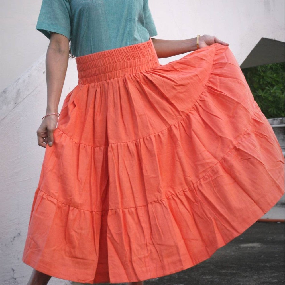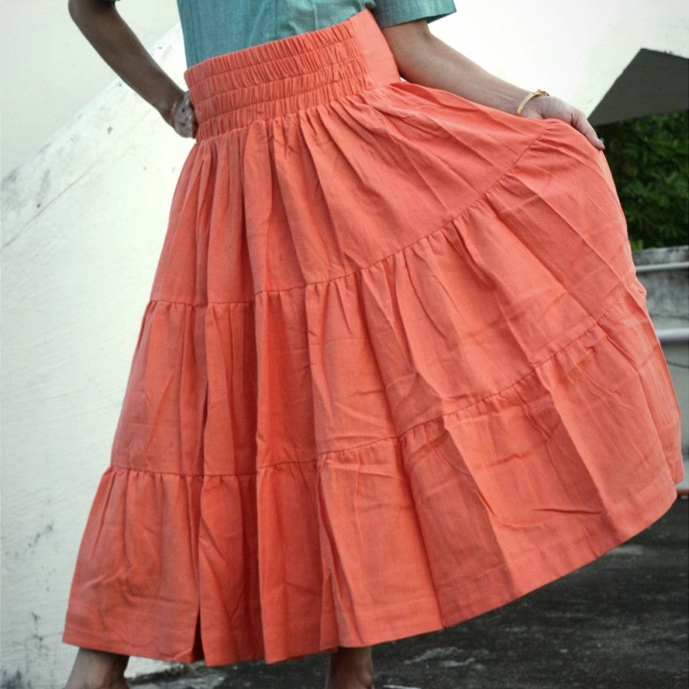 SAVANNAH -This tiered maxi skirt features layers pattern, perfect for adding a touch of elegance to your wardrobe. Available in size Long, this skirt is designed to flatter a range of body types and can be easily dressed up or down. Crafted from handwoven Linen & Cotton , this skirt ensures a comfortable and breathable wear throughout the day. Specifications: * Made by : frillsandfallsdesignerwear * Fabrics : 50% linen , 50% cotton. * Color : Frosted Saffron. * Size & Fit : S (32"inches) , Regular Fit * Design : Layered Tiered Flared Maxi Skirt. * Type : Flared. * Length : Maxi .(Ankle Length) * Hemline : Symmetric * Knit or Woven : Hand Woven * Closure : Front elasticated waistband and slip-on closure * Slit Detail : No Slit * Transparency : Opaque * The model is (5' 2?) tall with a 80 cm (31.5") bust, 66 cm (32") waist. She is wearing in size S.