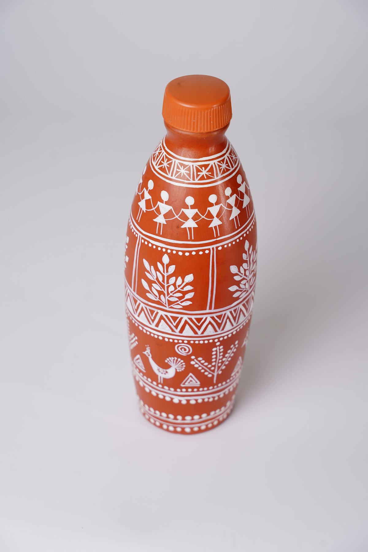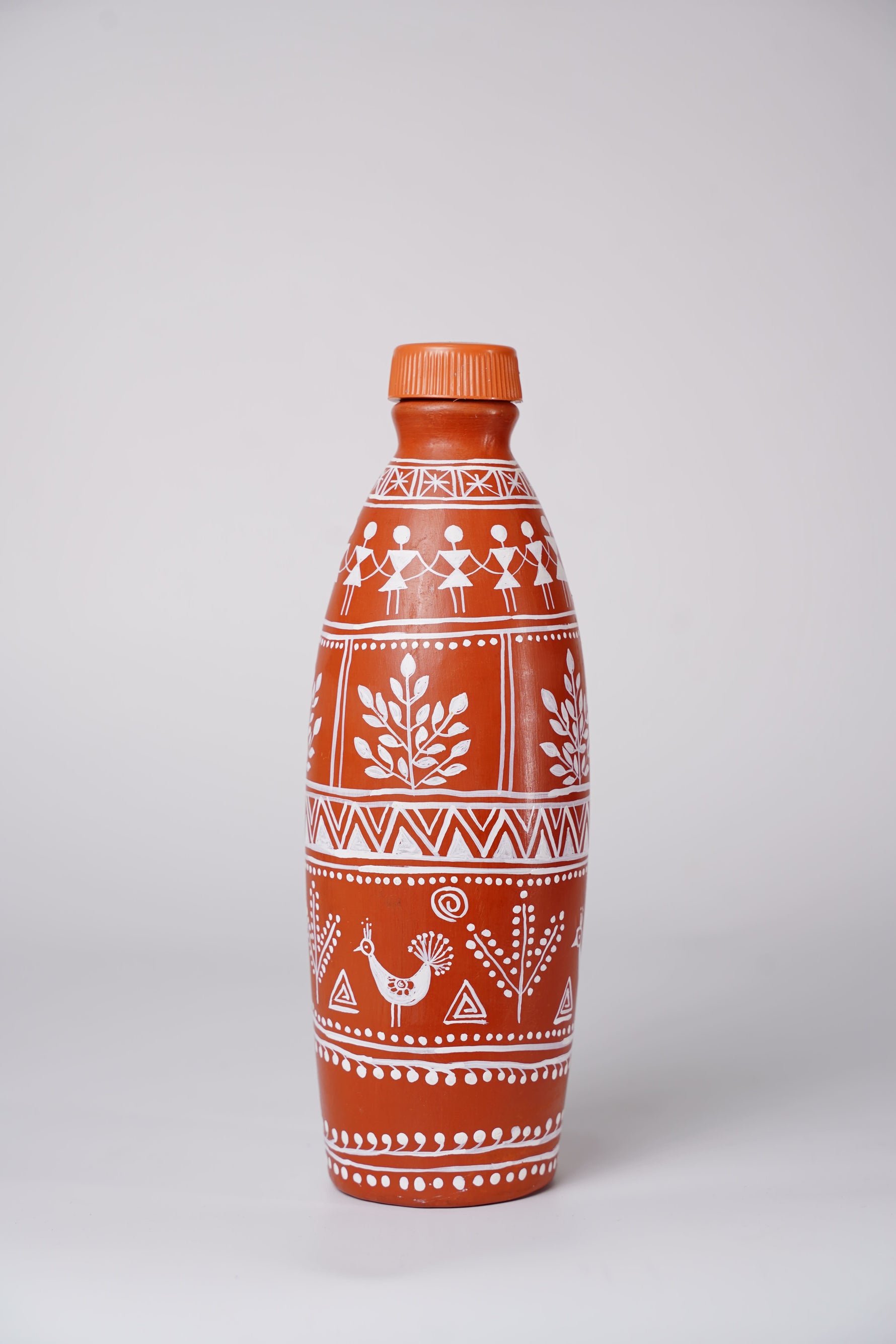The surface is hand-painted with authentic Warli motifs in white, featuring stylized human figures dancing in a circle, symbolic of community, joy, and togetherness. Delicate trees, plants, and geometric patterns surround the bottle, representing nature, balance, and rural life—core themes of Warli art. The intricate borders of dots, triangles, and lines enhance its visual appeal while maintaining the simplicity characteristic of this folk tradition.