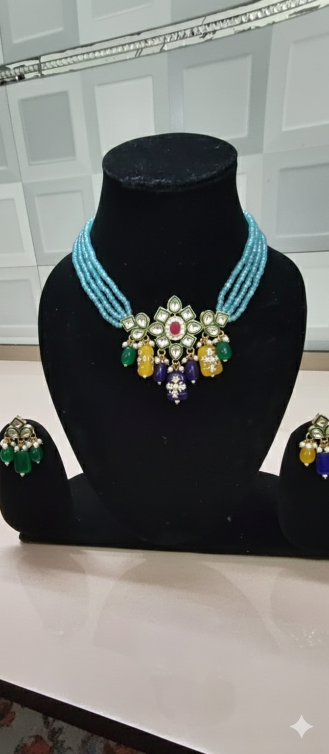 Our collections feature a mesmerizing array of Kundan, Polki, and semi-precious beadwork, meticulously crafted to create statement pieces that resonate with royalty. From sophisticated multi-strand pearl chokers to vibrant, color-blocked festive sets, every piece at LaksCreation is a work of art designed to make you stand out at weddings, festivals, and special occasions.