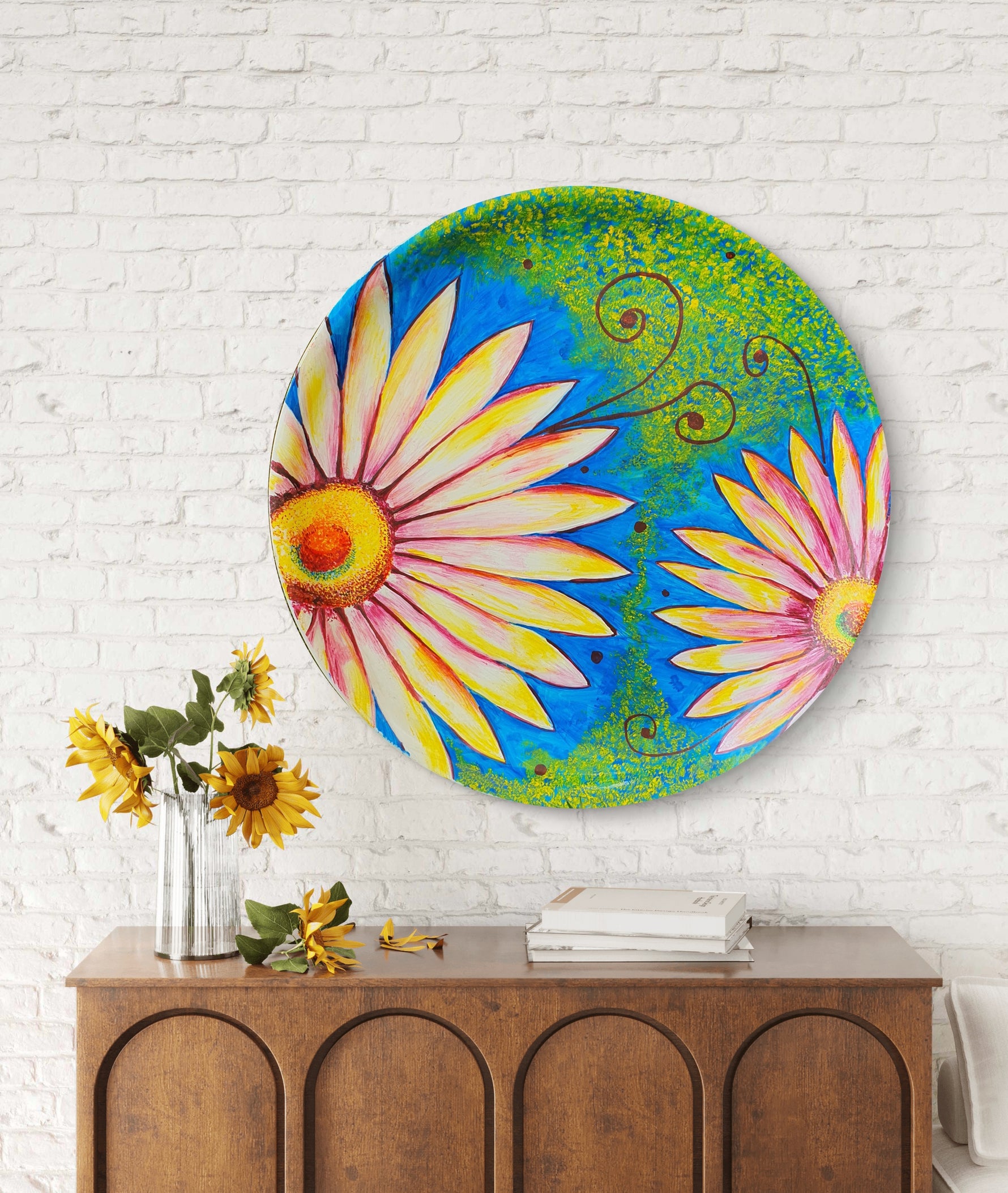 The beauty of summer is wonderful for your home with this amazing sunflower plate art! A cool plate for your mantle! Gorgeous and unique, this acrylic paint art is a wonderful addition to your home.