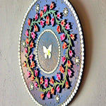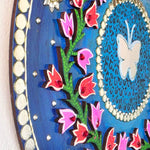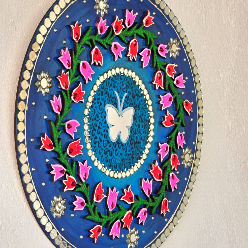 12in/30cms Round MDF 3D effect flowers N butterfly wall decor, decorated with shining stones and mirrors, acrylic butterfly in center, hooks attached and varnished.. ready to hang. Suits for home/office wall decor and gifting.