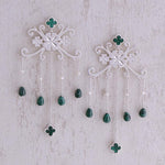 Chandelier style earrings from our '4 Leaf Clover' series of Talisman collection. Green textured 'Malachite stone' clovers are placed one each at the top of the danglers which has push back pin ; the other one is hanging as a drop along with other malachite beads. The hanging stone clover is given a delicate outline frame such that the clover is seen beautifully, same way at front or back, when the piece dangles. Product weight 21.5gms. Dimensions: Total earrings length 9.3cm ; width 4.5cm Green clover part including frame12mm*12mm (length * width) Green beads - 6mm length, 5mm diameter 3mm pearls Material Details: White Pearls Metal parts are all in sterling silver Stone used is Green Malachite (Origin - South Africa) Malachite. This lovely green textured mineral absorbs all negative energy and helps in stimulating heart ; throat chakras. Green crystals work on regeneration bringing success in new ventures. Read more here. Four leaf clover is rarely found in nature. It is believed to bring ‘Good Luck’ to its possessor. Each of the 4 leaves of clover represents a different quality. The first leaf representing hope, the second faith, the third leaf is for love and the fourth one brings good luck to its finder. Representation of this in the form of amulets makes a perfect piece of jewel to own. Care Instructions: Do not leave it exposed to air / water / chemical (deo or perfume). Store it wrapped in soft cotton cloth inside the box provided. Wipe the stones using soft cotton cloth. Be sure to dry the stone well to keep its brilliance ; shine, but only with soft cloth, never with paper.