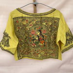 Yellow cotton tissue blouse with Madhubani art hand painting done on back and sleeves. The front open blouse has inner lining in the same colour and has enough margin for adjustment. The fabric is comfortable for the Indian weather conditions. Dry clean only Size- M-38, L-40