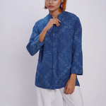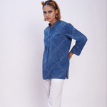 -This is a modern twist on a traditional kurta with signature side pockets. The cuffs can be folded and buttoned to make the sleeves shorter. -This is a unisex garment with relaxed and comfort fit. It has side slits and box pleats for ease of movement. -This is an Ajrakh hand-block printed kurta dyed using natural dyes. The fabric is co-designed with artisans from Kutch, Gujrat. -Actual colour may vary slightly from the pictures. -S01_BA_CX_01_01W