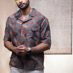 """- This is a classic camp collar shirt with relaxed half-sleeves popular amongst everybody and can be styled in multiple ways. - This is a unisex garment. It's comfortable and easy on the body, with half sleeves and a cool pocket. - Comes with coconut shell buttons. - This is an Ajrakh hand-block printed shirt dyed using natural dyes. The fabric is co-designed with artisans from Kutch, Gujrat. - Actual colour may vary slightly from the pictures.""" -S06_AJ_RC_01_01M