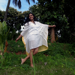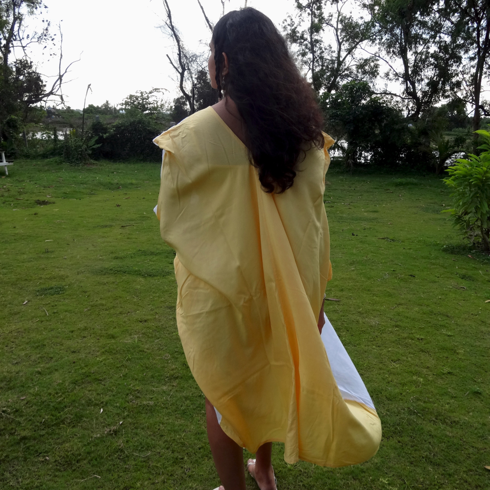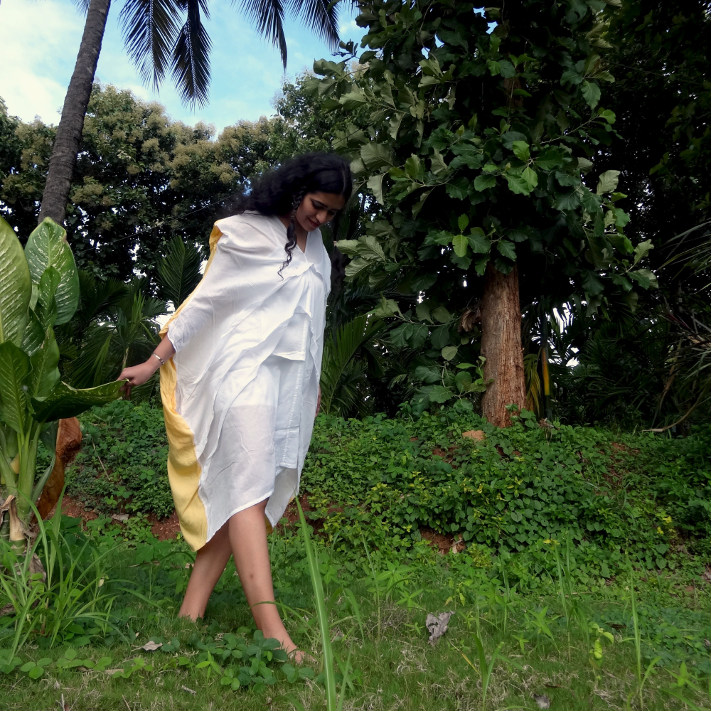 The DC dresses are a moment in air, with a structure designed to flow. The DC dresses have been designed using zero-waste pattern making techniques, creating no-waste during the garment cutting stage. Each detail has been created one at a time, away from your conventional dress structure. Hand-painted artwork and hand-pleated lines accompany the theme. - Size Guide (inches) : Bust - 32 to 38, Waist - 28 to 38, Hips - 36 to 48 - DC dresses are anti-fit. And can be worn between 4 sizes i.e XS - L . This also makes the dresses open for your ever-changing bodies over weeks and seasons - Material - 100% cotton (Reclaimed textile from Industry’s fabric deadstock) - Details: Knee-length dress with V-neckline, In-seam pockets, Lowered sleeve opening (elbow length) - The fabric being slightly translucent. - The dress can be over with a white slip or white/skincare innerwear. - Only a single piece available in every theme. And will not be re-made. - Care: Handwash in Cold water The Sun Dance dress from the Divine Consciousness collection symbolizes the idea that our journey transcends the past and future, continuously evolving with each moment. And the only true reality is the present moment. This collection is an artistic representation of the ever-present nature of consciousness, inspired by Buddhist teachings and the practice of meditation.