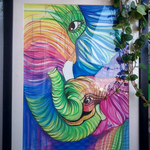 The bond between a mother elephant and her baby is truly a remarkable thing to witness. From the moment the baby is born, the mother elephant shows an immense amount of love and protection towards her young. One of the most striking examples of this love is the way a mother elephant will use her trunk to gently guide and support her baby, helping it to learn how to walk and explore its surroundings. She will also use her trunk to caress and comfort her baby when it is feeling scared or upset. This painting depicts the same Unframed
