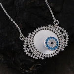 Neckpiece featuring ancient evil eye pendant symbolic of protection and good luck. Style is made of dull finished sterling silver and prong set zircons. 1mm white zircons form the outer part of the eye ; the in white, turquoise and black. Inside of the eye is embellished with 1.5mm white, turquoise ; black zircons. Ring clasp is used for the back closure of the neckpiece. Product weight - 9gms Dimensions: Chain length is 18inches + 2inch extension if you wish to wear a little longer. Pendant is 4cm width, 2.5cm height. EVIL EYE It is a traditional ancient symbol which is used to protect the wearer against the evil eye. It dates back to the Roman era and was a widely extended belief among Mediterranean and Asian cultures. Today these are commonly used in decorative items, printed on clothing or fashioned into jewelry. Care Instructions: Do not leave it exposed to air / water / chemical (deo or perfume). Store it wrapped in soft cotton cloth inside the box provided. Wipe the stones using soft cotton cloth. Be sure to dry the stone well to keep its brilliance ; shine, but only with soft cloth, never with paper.