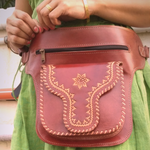 Western buckle leather purse handmade from genuine leather in dark brown. It's an absolutely gorgeous bohemian style bag tooled with an ethnic pattern. The ethnic purse comes magnet clouser in the front . It is a practical hippie leather purse, medium size ideal for many occasions. Beautiful bohemian look and great look for festivals, travelling and every day. Measurements: 11" x 10" x 3" = 28cm x 26cm x 7cm Waist Belt :20" = 32cm HandCrafted Hand Stitched. Cruely Free Leather. Country of Origin - India Usage: Hand Bags. Fix Type: Hand Pasted and Stitched ( No Machine Involvement). Designs : European. Leather Details: By recycling the dead cattle, our Nomadic pastoralist Artisans give new life to the waste sturdy hides by hand stitching leather seams with a coloured cotton cloth & giving different shapes to the leather by transforming it into utility products or adornments.