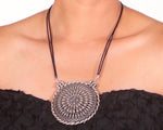 Experience timeless elegance with our folk fusion pendant series. This style has round pendant strung in twin leather cords. Product weight: 58gms Dimensions: pendant 8.5cm diameter, 22inches leather cord Metal: Sterling Silver (925) with oxidized finish. Sterling silver is also popularly known as ‘ sterling silver 925 ’ or simply ‘ 925 Silver ’. It is a metal, which consists of 92.5% pure silver (which is why it gets its name as sterling silver 925) and 7.5% alloy that can include other metals such as zinc, copper etc. To learn in detail about sterling silver and why should you buy this jewelry, read here . Customize: If you wish to customize the style with chunky oxidized chain or silk thread cord, do write to us. Care Instructions: Rinse the jewelry with water, then dry and buff with a soft cloth. Keep it away from perfumes. Store it in airtight vacuum bag, wrapped in a soft cloth.