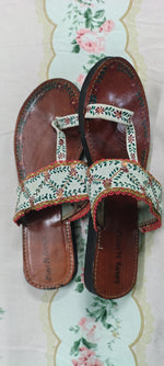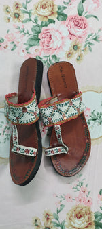 Pure leather anti skid rubber sole base kolhapuri slippers for women with hand paint design on straps and foot sole to make it look elegant and stylish with indo western vibes.A great combination with denims , churidar kameez suits and lukhnowi outfits.A must have for all ages.Inspired with Rajasthani folk motifs of bel and buttis.Colour can be changes as per customer request as the design is prepared fresh on order