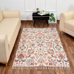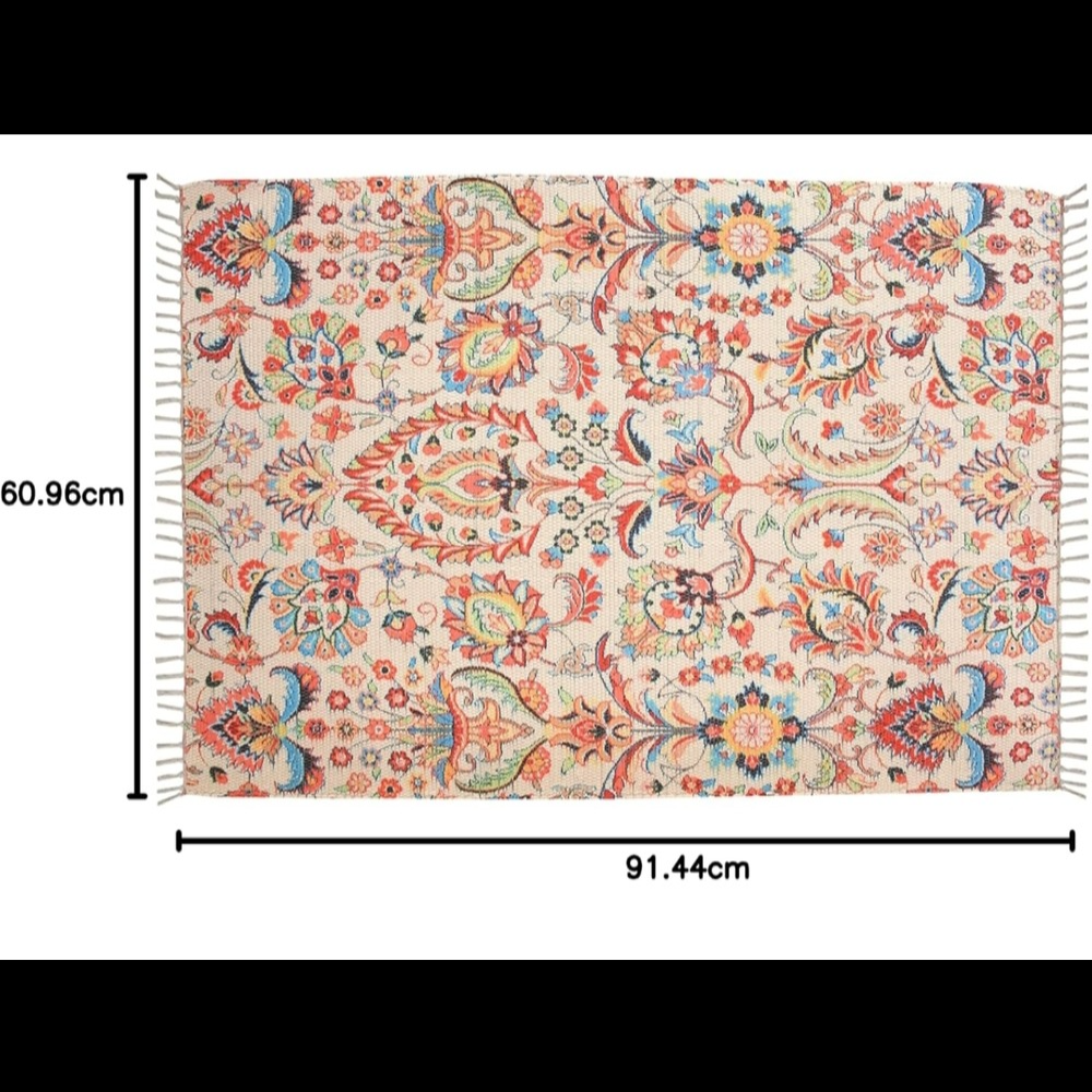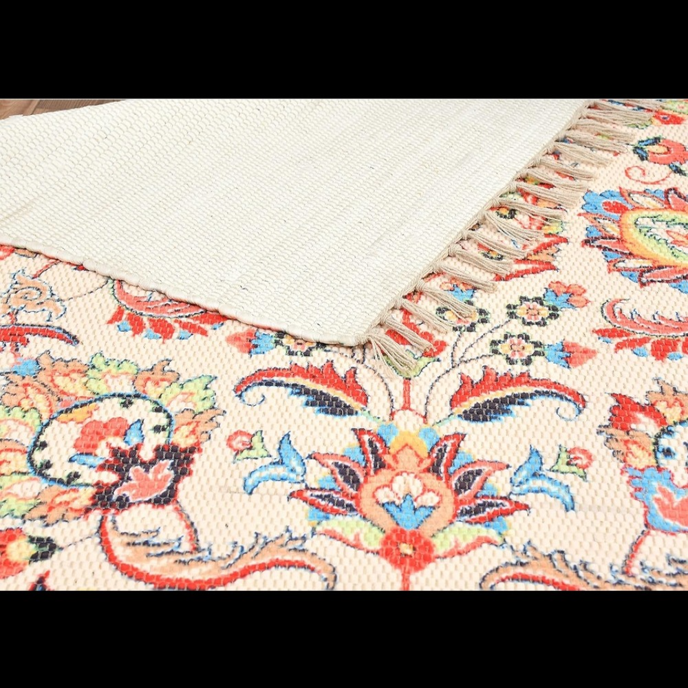 Elevate your home decor with this stunning handmade sustainable printed dhurrie rug, expertly crafted from recycled chindi yarn. This eco-friendly rug boasts a unique blend of traditional and modern techniques, featuring vibrant digital prints that will not fade with washing, ensuring a long-lasting and beautiful addition to your home. Perfect for indoor and outdoor use, this rug adds a bohemian touch to any living space, including living rooms, bedrooms, and dining rooms. Its unique design and vibrant colors will enhance the aesthetic of any room, creating a warm and inviting atmosphere. Made with durability in mind, this rug is easy to maintain with simple hand washing, ensuring it remains a beautiful and functional part of your home decor for years to come. To keep your rug looking its best, simply hand wash it with normal water at room temperature, and avoid using harsh chemicals or bleach. Available in various patterns and sizes, this rug is a must-have for those seeking a sustainable and stylish decor solution. Whether you're looking to add a pop of color to a room or create a cohesive look, this rug is the perfect choice. Size: 3 feet x 5 feet, Cream Floral. Please note that product color may slightly vary due to photographic lighting sources or your settings on your monitor.