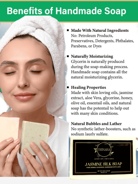 Pure Handmade Jasmine Soap provides gentle, natural cleansing with hydrating, antiseptic and anti-aging benefits. Its soothing aroma relaxes the senses. It’s eco-friendly and supports artisanal craftsmanship.