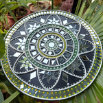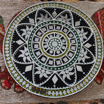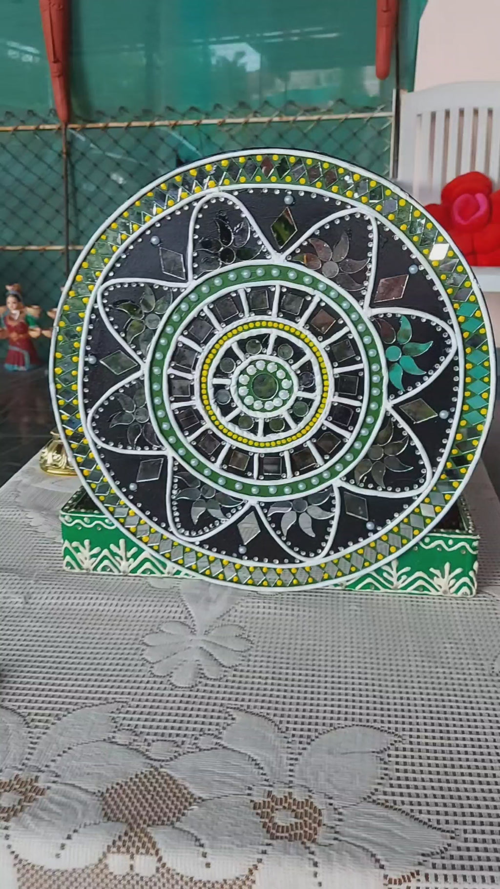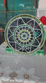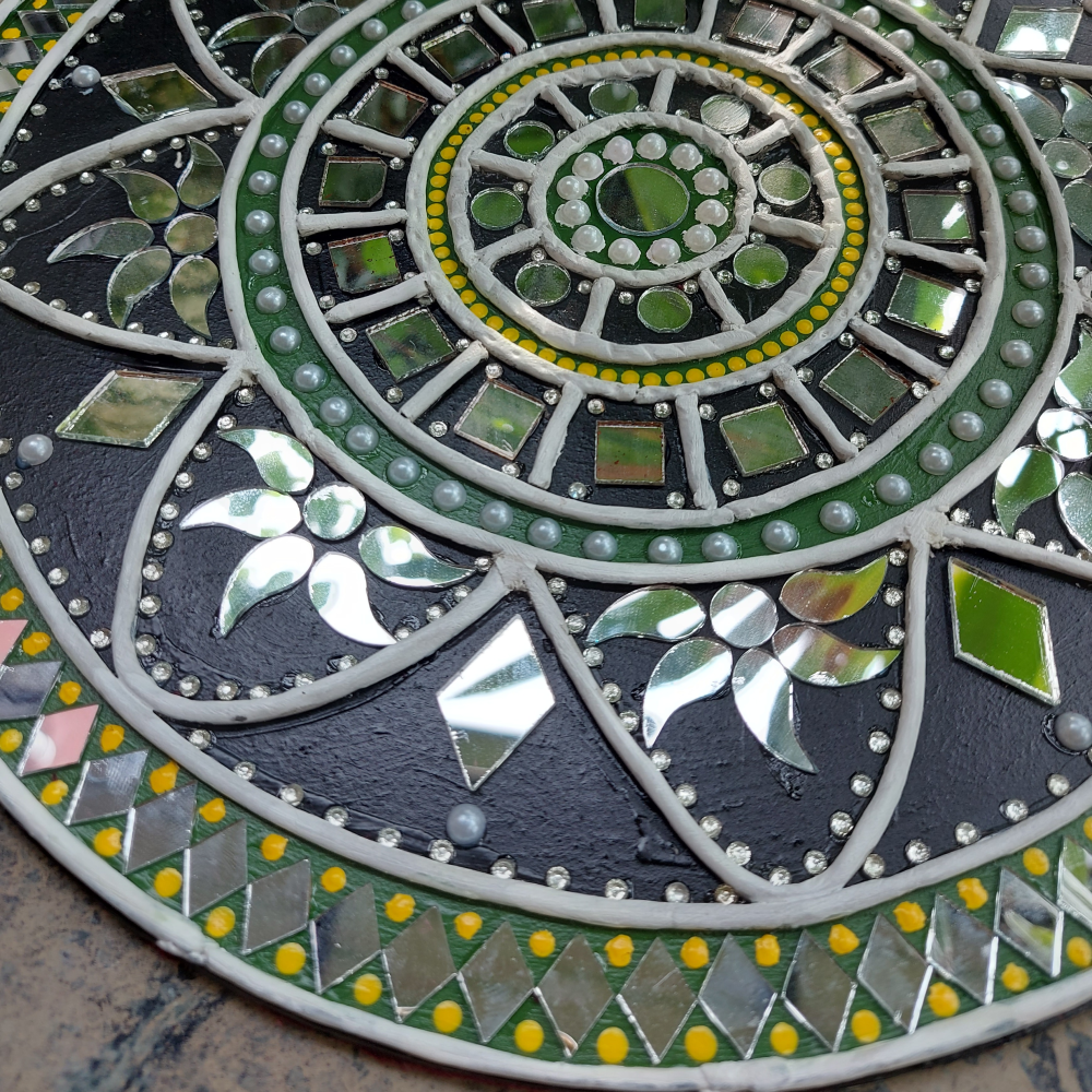 ABOUT THIS PRODUCT: It makes your home beautiful. Looks absolutely exquisite during festivals or functions. Traditional handmade items. Decorate your home,floor, table, Pooja room etc. Best gifting option for occasions like birthday, weddings, kitty party, corporate gift, house warming party, Diwali gift etc. Very economical and elegant choice. Must have item for festivals and Indian occasions. No of contents -1 decorated MDF base Material -MDF board//glass mirrors//stones Shape-Round Thickness - approx 2.5 mm Dimensions -12inches Weight -approx 230gm Type-mirror work Color -sap green and black Pattern-handmade mirror work Care-Dust with dry cotton cloth. Don't wash. Price: Shipping charges extra NO COD NO RETURN NO REFUND NO EXCHANGE Disclaimer - The images are for illustration purposes only. The actual colour may vary slightly from the images due to photographic effects and lighting. There can be minor imperfections as these are handmade.
