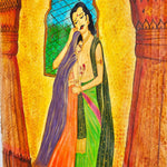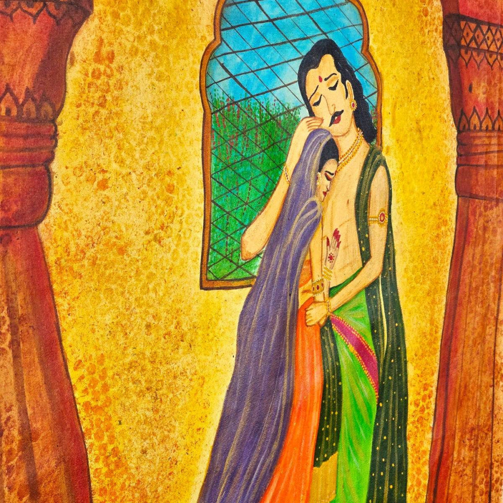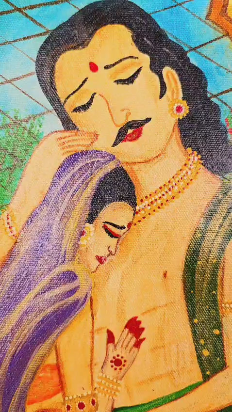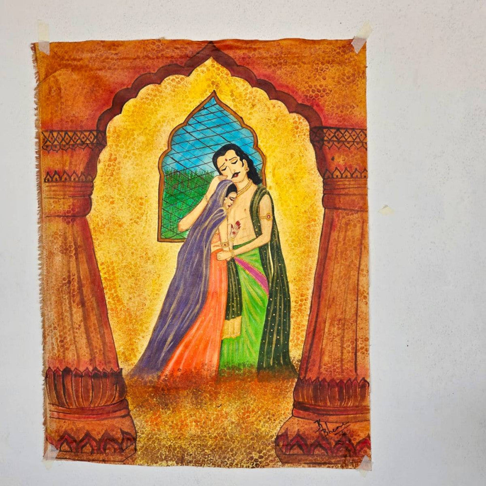 23x32in(58x81cms) Indian ancient Royal couple comforting each other, Acrylic/oil painting on canvas sheet, comes in roll form, No frame, completely varnished and rust proof. Comes with Artist authentication certificate. 2inches left on each side for framing. Perfect for home/office wall decor and gifting.