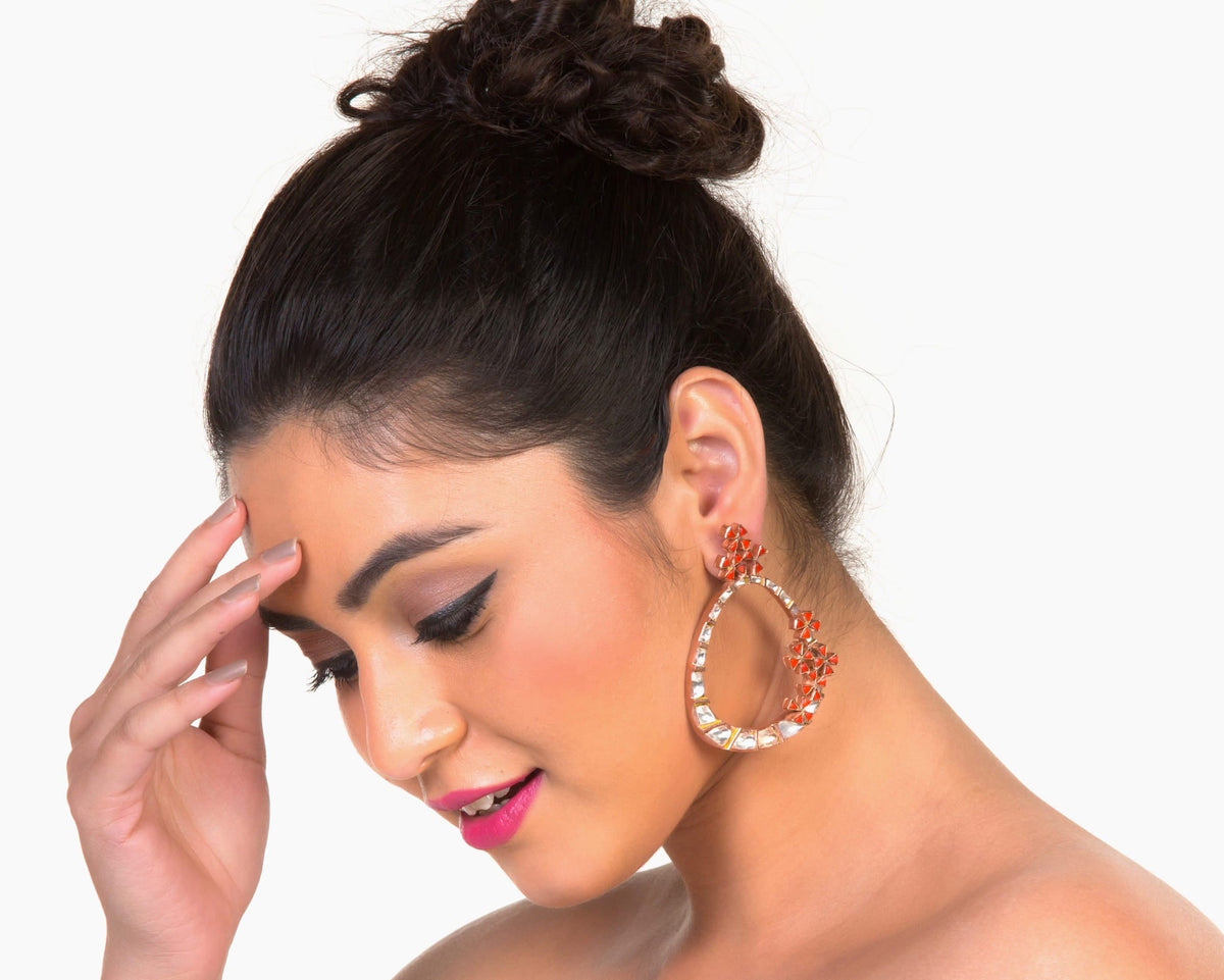 Win hearts with these dainty Kundan hoop style earrings. Total earrings length is 6.5cm. Material used: Base metal is copper with rose gold plating. Silver Kundan work. Flowers made out of coral stone. KUNDAN is unique style of jewelry in which glass pieces are embedded in gold or silver foil to create absolute masterpieces. To know more about this art form read here . Care Instructions: Keep it away from spray perfume/deo/moisture. Store it wrapped in soft cotton cloth.